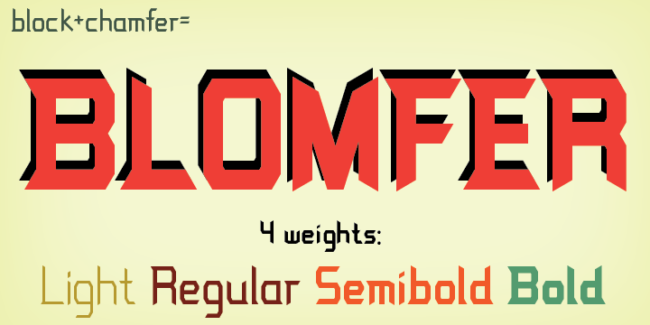 | Blomfer is a dynamic Graphic Typeface based on the chamfering of a simple block font. The design element of the chamfered corners also expresses as the opposite, protruding serifs and angled terminations to ascenders and descenders. It is available in four weights all of which contain 375 glyphs that includes ascents, ligatures, and mathematic symbols to meet the needs of most Roman based languages. |